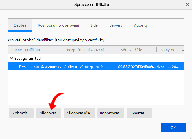 Zálohování certifikátu v prohlížeči FireFox
